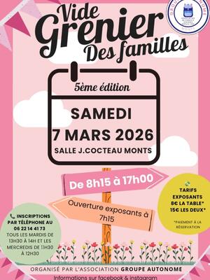 L'association des parents d'élèves du groupe autonome des écoles: maternelle beaumer, élémentaire pierre et marie curie et le collège du val de l'indre de monts organise pour la 5 ème édition son vide grenier des familles le samedi 7 mars 2026