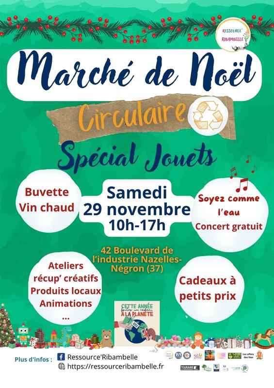 C'est maintenant une tradition pour la ressourcerie d'organiser son fameux marché de noël circulaire !! L'occasion de rappeler qu'au moment des fêtes aussi, d'autres gestes sont possibles pour préserver notre environnement : acheter des objets d'occasion à offrir, se tourner vers les produits locaux, faire ses achats de noël dans la bonne humeur en allant à la rencontre des acteurs de votre territoire !! Au programme cette année : de 10h à 17h : - retrouvez notre sélection d'objets d'occasion à offrir, et notamment de jouets grâce à notre collecte organisée auprès des écoles du val d'amboise ! - stands d'artisans et produits locaux, animations ! - buvette et vin chaud ! A 11h et à 15h : - des ateliers de récup' créatifs (gratuits et sur inscription à la ressourcerie ou à ) : bulbes de noël le matin, fabrication de décos de noël récup' l'après-midi - un concert gratuit avec soyez comme l'eau à 15h30 ! On espère vous retrouver aussi nombreux-ses que les années précédentes pour cette journée chaleureuse, placée sous le signe d’un noël respectueux de l'environnement !! A bientôt à la ressourcerie