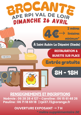 Brocante au profit de l’association des parents d'élèves - à l'ancien stade de saint-aubin-le-dépeint, de 8h à 18h - entrée gratuite pour les visiteurs. - restauration buvette sur place tout au long de la journée -