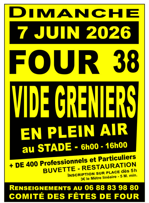 Le comité des fêtes de four organise son grand vide greniers gratuit en plein air . Près de 400 exposants entre brocanteurs et particuliers se réunissent chaque année au stade de four.