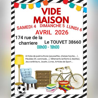 Vide-maison samedi 4 dimanche 5 lundi 6 avril 2026 de 8h à 18h. Le touvet 38660 au 174 rue de la charriere sur terrain privé. Parking à côté de la mairie. Du cimetière et intermarché. Meubles. Électroménagers. Outils. Horlogeries. Vaisselle etc....!
