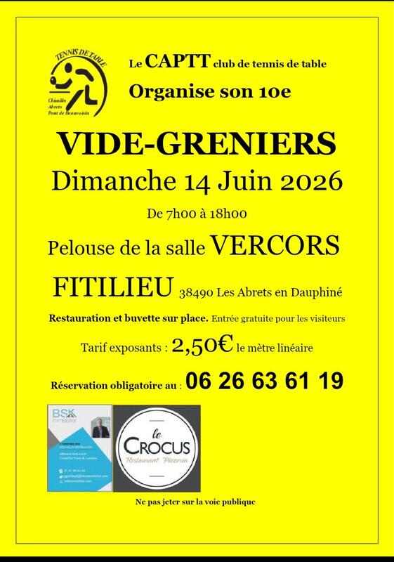 Grand vide grenier organisé le 14 juin 2026 par le captt ( tennis de table chimilin / les abrets / le pont de beauvoisin ).