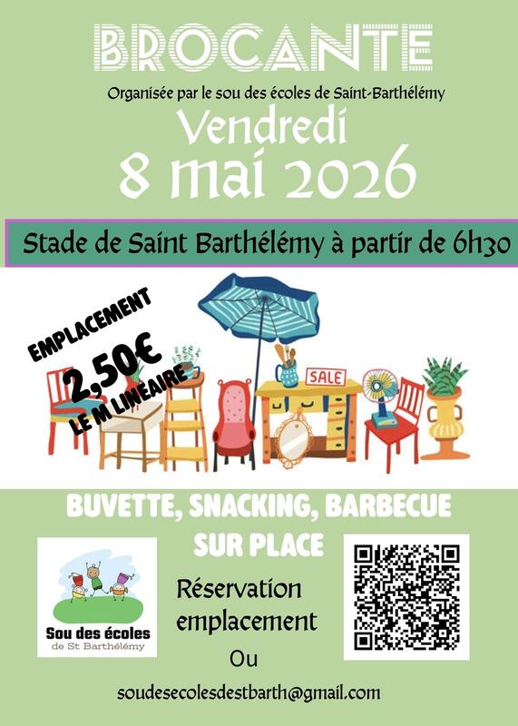 Venez nombreux à la brocante de l'école de saint-barthélemy, qui se tiendra le 8 mai au stade! Cette journée festive sera l'occasion pour petits et grands de dénicher des trésors tout en soutenant notre école.