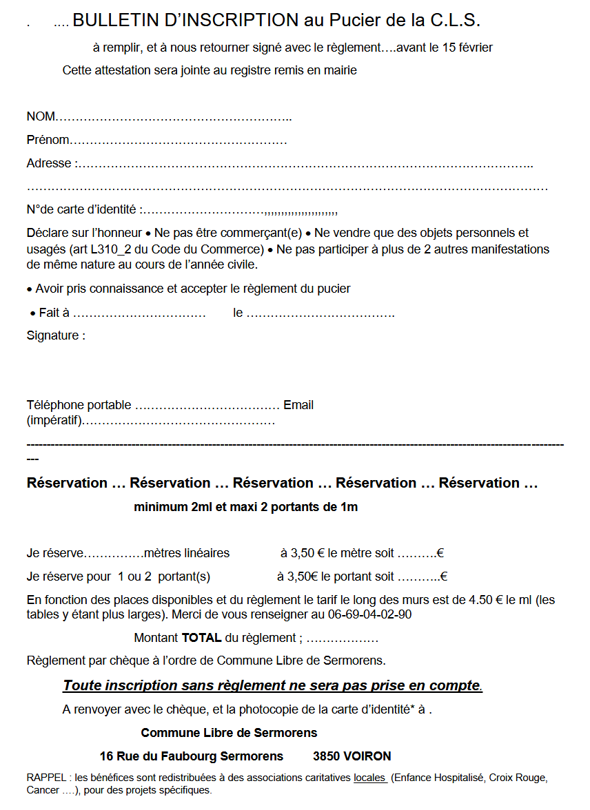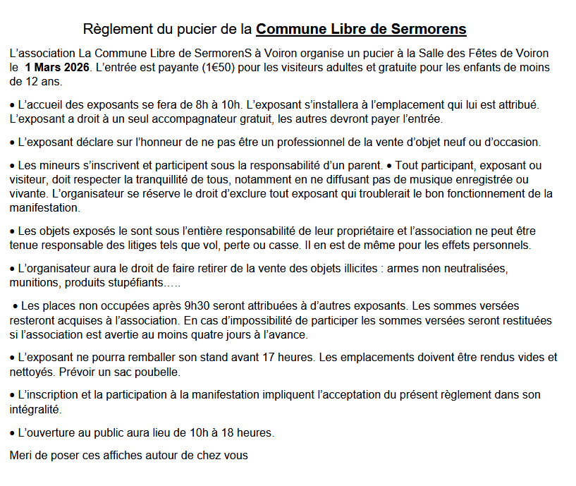 Le grand pucier annuel de la commune libre de sermorens avec de nombreux exposants, sa buvette et ses délices préparés par les membres de l'association.
