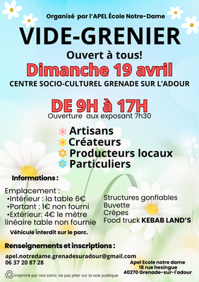 L'apel de l'école notre-dame organise son grand vide grenier et vous êtes invités à y participer!