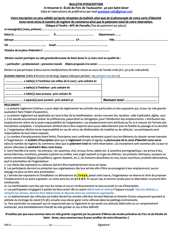 les exposants sont invités à se présenter le matin à partir de 7 h à l'ancien couvent des jacobins. Aucune inscription ne sera prise ce jour-là. Le nombre d’exposants est limité. Clôture des inscriptions le vendredi 6 mars 2026 inclus.