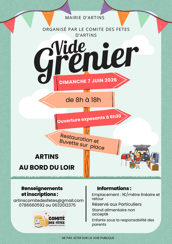 Vide-grenier au bord du loir à artins le dimanche 7 juin 2026 de 8h à 18h.
