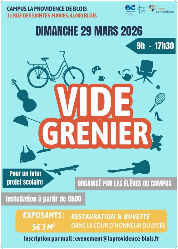 Des élèves du campus la providence de blois et leurs professeurs vous proposent son premier vide grenier dans la cour d'honneur du lycée.