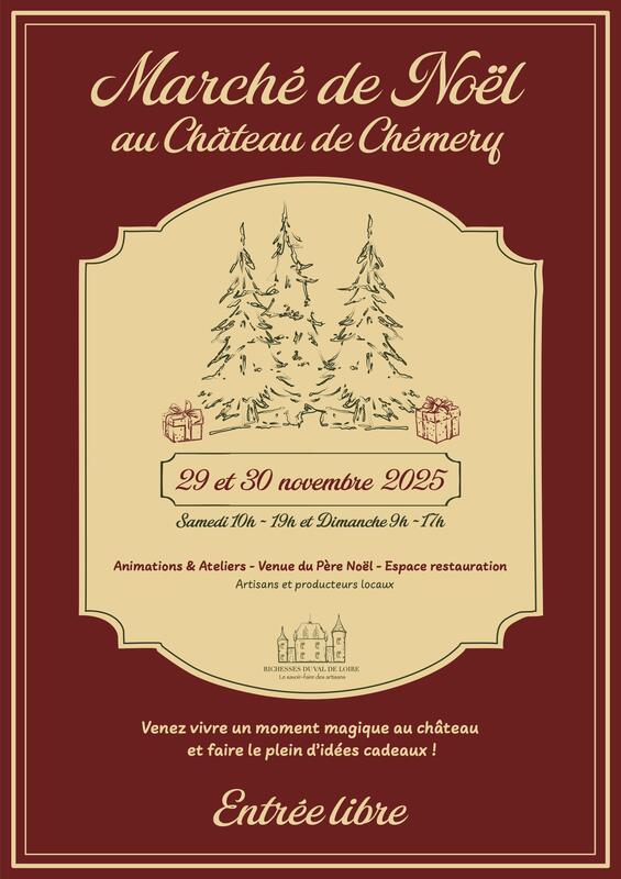 Première édition de notre marché de noël au château, par l’association richesses du val de loire : 44 artisans et producteurs locaux vous permettront de découvrir leurs créations et produits. Idéal pour trouver des cadeaux originaux et se régaler de bons produits locaux : escargots, fromages, chocolats, biscuits, café, rhum et vins. Tombola des artisans avec de très beaux lots, atelier lettres au père noël, lectures de contes de noël, présence du père noël, ateliers avec nos artisans… côté restauration : espace couvert, truffade, bar à huîtres et salon de thé avec chocolat chaud, thé, café, vin chaud pâtisseries et crêpes.