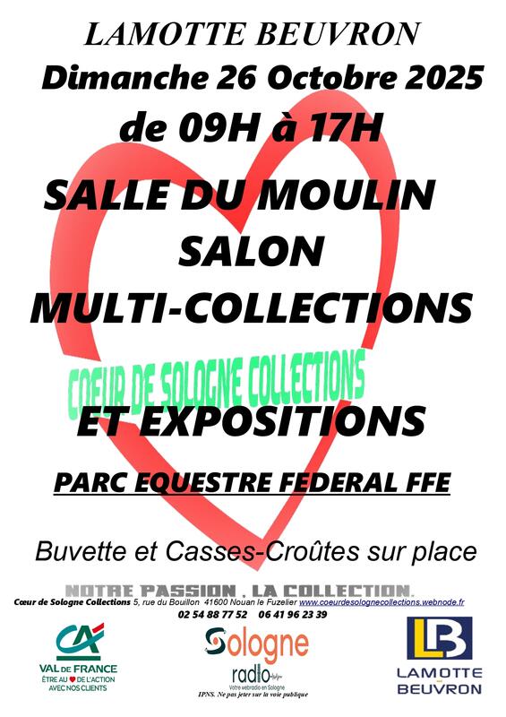 Nous organisons notre nouveau salon des collectionneurs, à la salle du moulin, au parc équestre fédéral de lamotte beuvron. Comme d'habitude, vous pourrez y retrouver les collections habituelles (monnaies, timbres, fèves, pin's, miniature et des moins communes). Le romo rc modèles, de romorantin, sera présent, pour le plaisir des petits et des grands .En plus il y aura plusieurs expositions. Pour savoir quelles expos, il faudra venir...!!! Le chemin pour accéder à la salle du moulin de la ffe sera flécher depuis le centre de lamotte beuvron. Entrée gratuite, buvette et petite restauration. Cette manifestation est organisée, en partenariat avec la ville de lamotte beuvron, le crédit agricole val de france, super u salbris, fréquence trois la radio locale et sologne radio votre web radio, au coeur de la sologne.