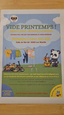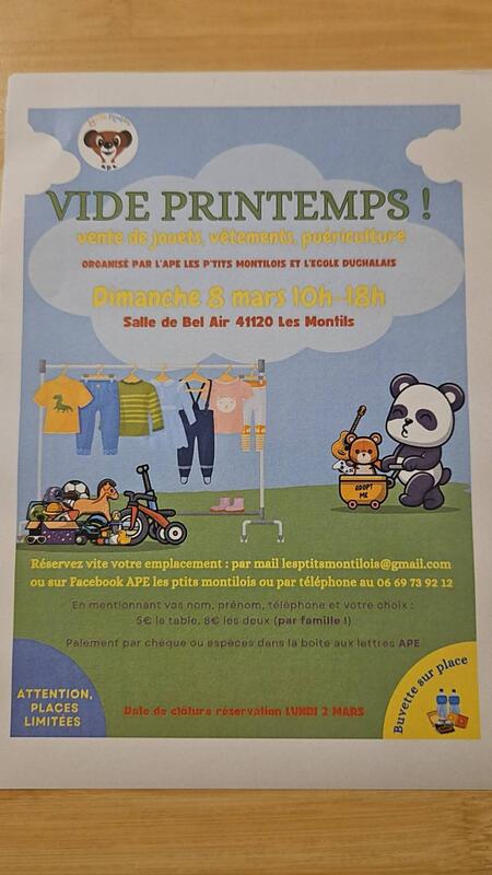 Vide printemps organisé par l'école et l'ape les ptits montilois le dimanche 8 mars de 10h à 18h.