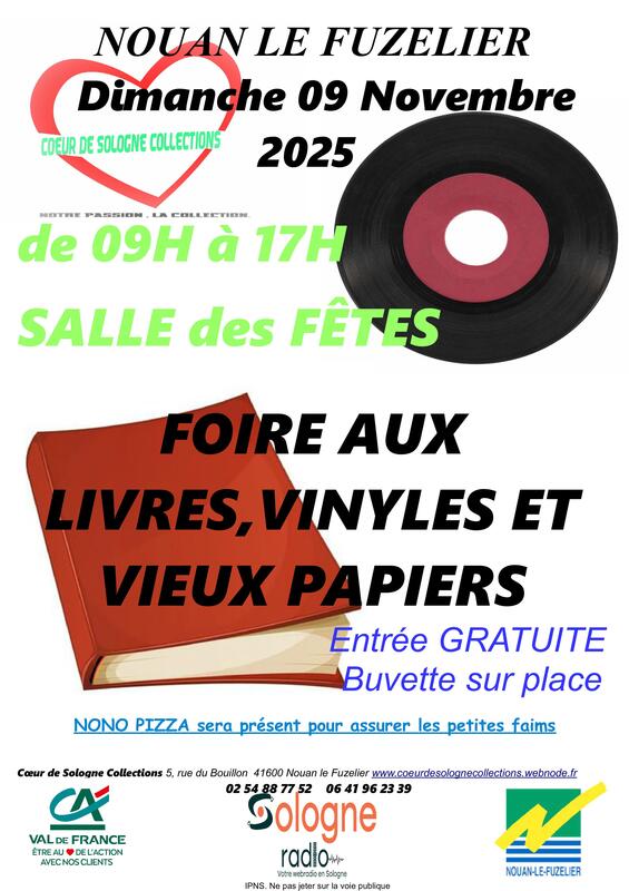 Nous organisons notre nouvelle foire aux livres, vinyles et vieux papiers, en partenariat avec la ville de nouan le fuzelier, sologne radio, fréquence trois, super u salbris et le crédit agricole val de france . Si vous avez des ouvrages, des vinyles ou des vieux papiers que vous ne souhaiter pas garder venez les vendre à un petit prix.