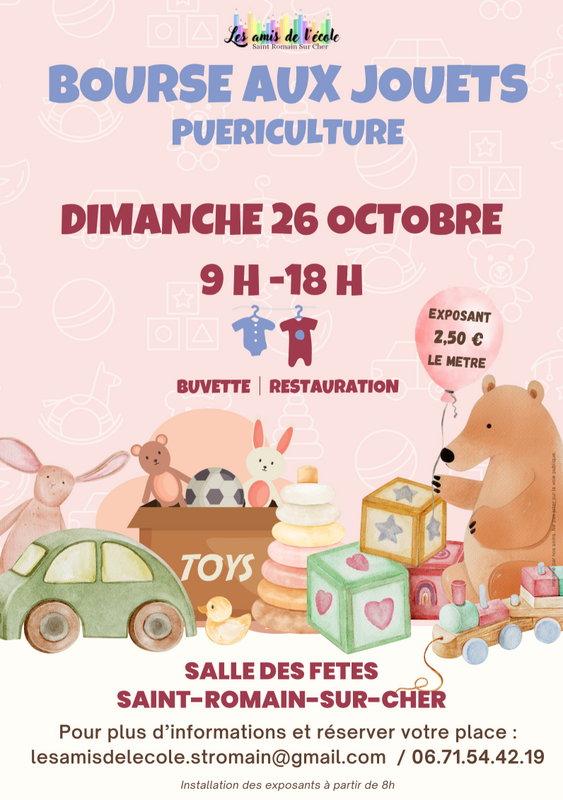Vous cherchez de bonnes affaires pour vos enfants ou souhaitez faire de la place à la maison ? Rendez-vous dimanche 26 octobre, de 9h à 18h, à la salle des fêtes de saint-romain-sur-cher pour la bourse aux jouets et à la puériculture, organisée par les amis de l’école.