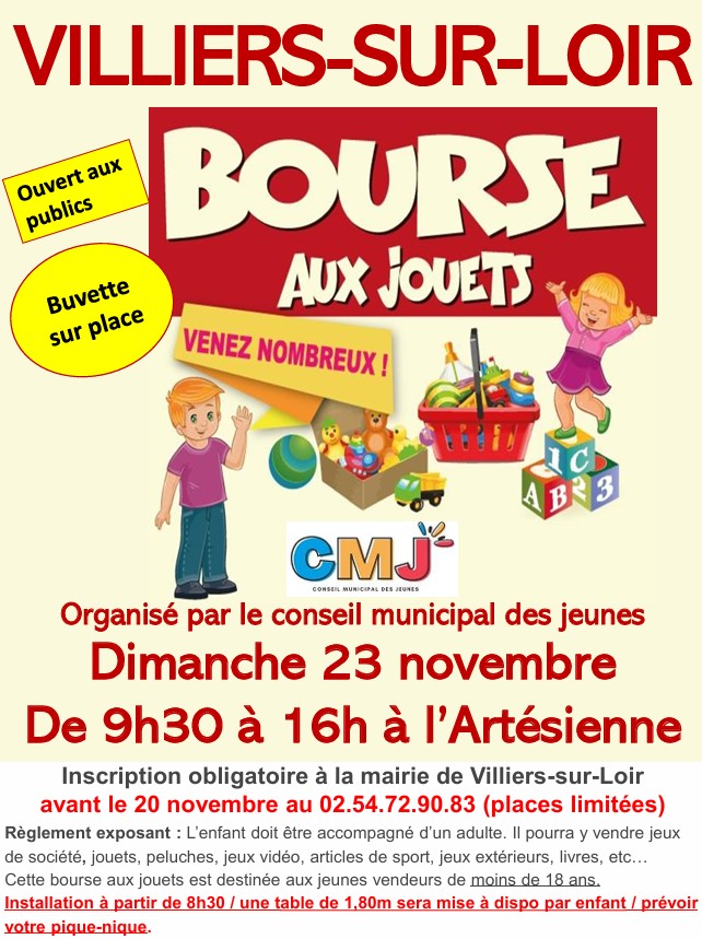 Règlement exposant : l’enfant doit être accompagné d’un adulte. Il pourra y vendre jeux de société, jouets, peluches, jeux vidéo, articles de sport, jeux extérieurs, livres, etc…(interdit : articles de puériculture, vêtements de grossesse, vêtements d'enfants). Cette bourse aux jouets est destinée aux jeunes vendeurs de moins de 18 ans.
