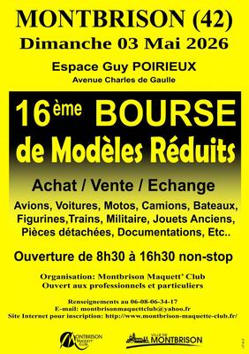 Le montbrison maquett’ club organise sa 16ème bourse maquettes miniatures le dimanche 3 mai 2026 à l’espace guy poirieux, avenue charles de gaulle à montbrison. Tous les domaines y seront représentés : avions, voitures, motos, camions, bateaux, figurines, trains, militaire, jouets anciens, etc...