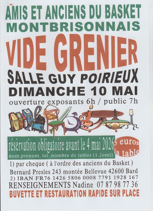 Vide grenier des amis et anciens du basket montbrisonnais dans la salle guy poirieux; tables fournies 5€ et portants à amener 3€. Restauration rapide et bar sur place . Parking