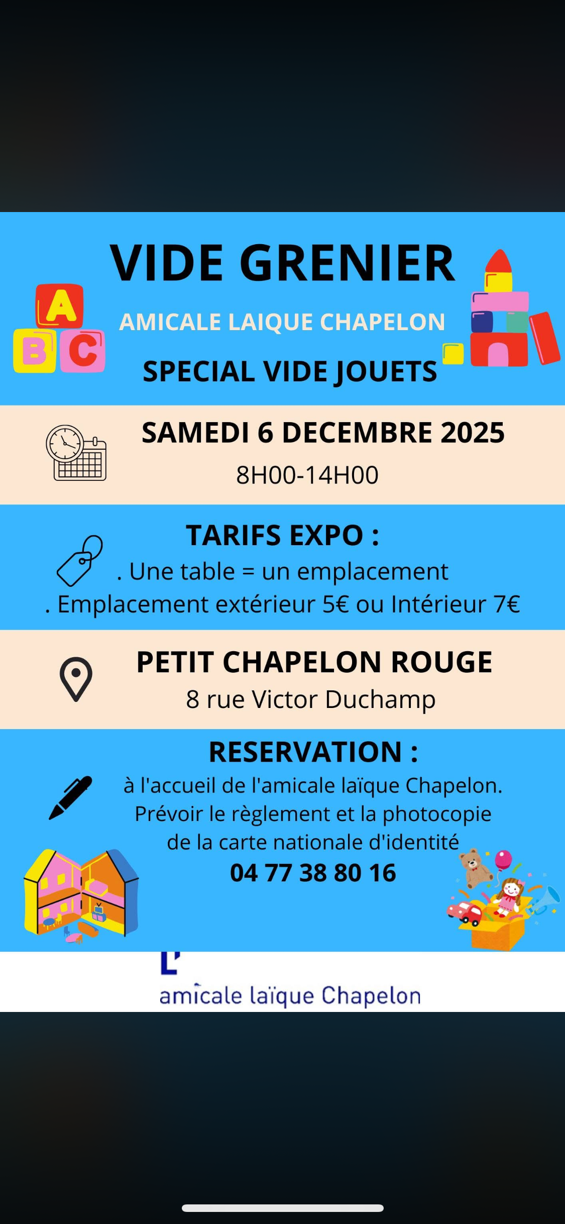 samedi 6 decembre de 8h00- à 14h00 l'amicale chapelon organise un vide grenier spécial vide jouets au petit chapelon rouge : situé 8 rue victor duchamp à côté de la place jacquard.