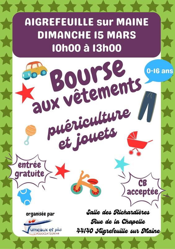 Braderie organisée par l'association jumeaux et plus 44. Vêtements de 0 à 16 ans. Matériel puériculture jeux, jouets et livres enfants. Vêtements triés par âge et sexe. Paiement par cb possible. Dimanche 15 mars de 10 h à 13 h, salle des richardières, rue de la chapelle, aigrefeuille-sur-maine. Gratuit.