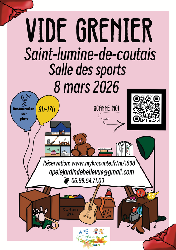 L’association des parents d’élèves de l’école publique le jardin de bellevue à saint-lumine-de-coutais organise son vide-grenier annuel. Une belle occasion de soutenir les projets de l’école tout en donnant une seconde vie à vos objets !