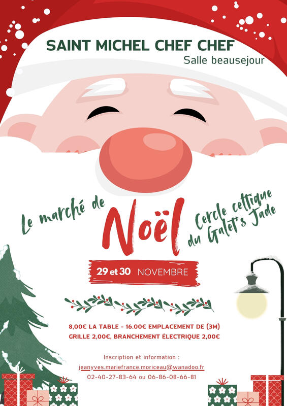 Marché de noël galet’s jade 2025 l’association galet’s jade vous donne rendez-vous pour son marché de noël annuel le samedi 29 et dimanche 30 novembre 2025 à la salle beauséjour de saint michel-chef-chef. Artisans, créateurs et producteurs locaux seront au rendez-vous pour vous proposer de belles idées cadeaux et des gourmandises de saison. Infos exposants : • forfait table : 8 € • emplacement libre (3 mètres) : 16 € • location grille : 2 € l’unité • branchement électrique : 2 € (sous réserve) inscriptions & renseignements : vous attendons nombreux pour partager ensemble la magie de noël