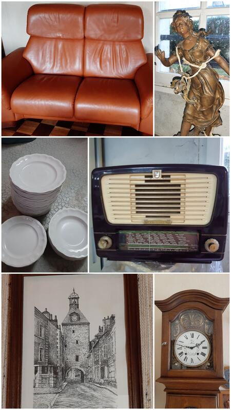Mobilier de style rustique (buffets, chaises tapisserie, horloge comtoise..), vintage (armoire bibliothèque, lits 1 place, lit bébé, armoire..), petit mobilier (tables basses, tables gigognes..), vaisselle, petit électroménager, objets décoration, luminaires, tableaux, livres, disques, jouets, vêtements, linge de maison.. N'hésitez pas à demander des précisions ou à prendre rv si vous souhaitez mettre une option sur des meubles ou objets. Photos sur demande.