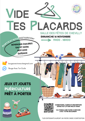 Bouge avec ton école organise un vide tes placards le dimanche 16 novembre 2025 de 09h00 à 18h00 buvette et petite restauration rue du stade chevilly - salle des fêtes - heure d'arrivée 8h00 - dimanche 16 novembre 2025 de 09h00 à __ et de 18h00 à __ (bouge avec ton école organise son traditionnel « vide tes placards », qui aura lieu le dimanche 16 novembre, de 9h00 à 18h00, dans la salle des fêtes de chevilly (45520). Parking à proximité buvette et petite restauration sur place)