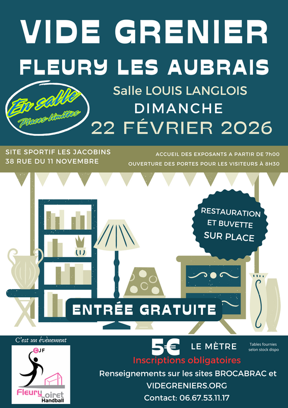 Le vide-greniers du fleury loiret handball se tiendra le 22 février 2026 à la salle polyvalente louis langlois de fleury les aubrais