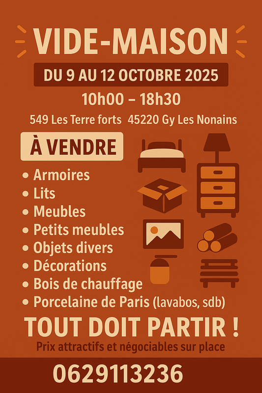 beaucoup de choses à vendre des lits, lavabos avec colonne signé porcelaine de paris, une grande horloge, une coiffeuse, une singer (machine à coudre), miroirs anciens, grandes armoires en bois de bonne qualité, têtes d'animaux empaillés, rocking-chair, etc....