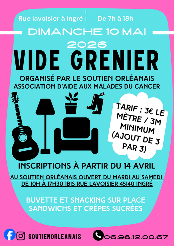 Le soutien orléanais organise pour la 5ème année son grand vide grenier annuel au profit des malades du cancer le dimanche 10mai 2026 dans la rue lavoisier à ingré