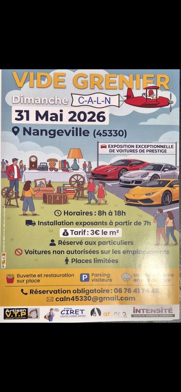 Vide-grenier organisé à nangeville (45330) le dimanche 31 mai 2026. L’événement se déroulera de 8h à 18h. Sur place, les visiteurs pourront profiter d’une buvette et d’un espace de restauration, ainsi que d’un parking dédié. Une exposition exceptionnelle de voitures de prestige est également prévue, apportant une attraction supplémentaire à la journée. Un événement convivial pour chiner, vendre et passer un bon moment en famille.