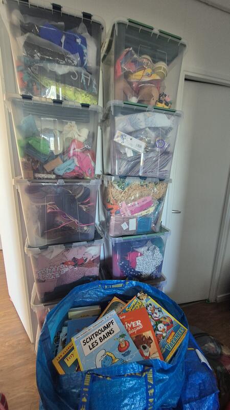 il y aura des vêtements pour femme et enfant dvd livres chaussures femmes beaucoup de décorations d’anniversaire et des jouets.