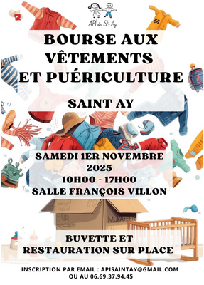 L'api de saint ay organise une bourse aux vêtements (toute taille) et matériel de puériculture le samedi 1er novembre 2025 de 10h à 17h. A la salle françois villon à saint ay