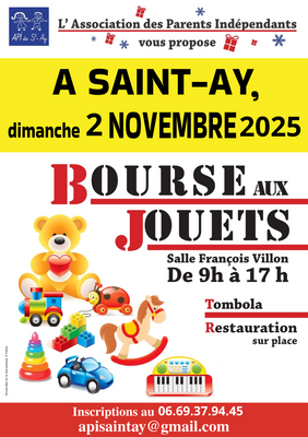 L'api organise sa bourse aux jouets dimanche 2 novembre 2025 de 9h00 à 17h00 a la salle françois villon, saint ay buvette et restauration sur place.