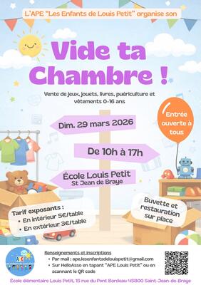 Inscription et paiement sur : https://www.helloasso.com/associations/ape-les-enfants-de-louis-petit/evenements/vide-ta-chambre-2026