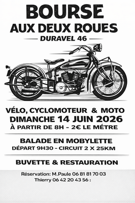 Le comité des fêtes de duravel organise sa 2ème bourse aux 2 roues le dimanche 14 juin 2026 sur le foirail. Balade mobylettes dans la journée ( 2 circuits de 25 kms)