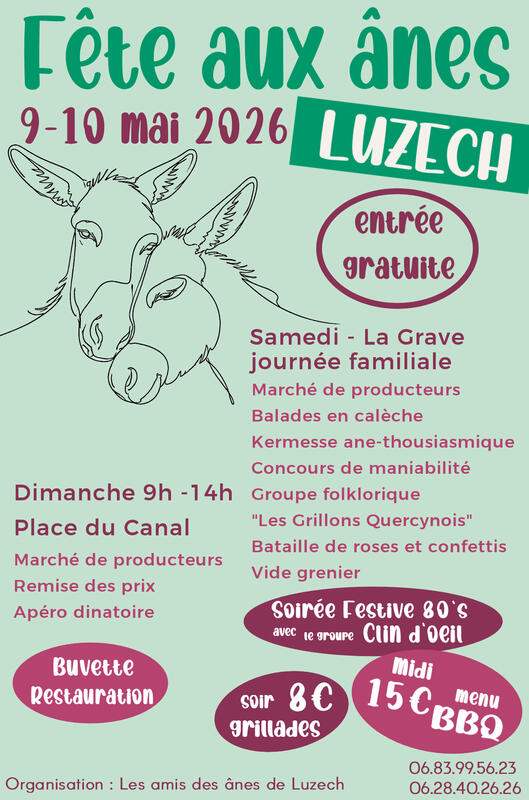 Pour la troisième fois l’association organisera la fête aux ânes pendant le weekend le 9 et 10 mai 2026. Cette manifestation a pour objectif de promouvoir les métiers et les activités liés au monde de l’âne, animal souvent méconnu mais remarquable par son intelligence, son courage et sa force. Elle visait à mettre en lumière les multiples rôles de l’âne : promenade en calèche, randonnée avec bât, travail aux champs ou dans les vignes, médiation animale, ainsi que son rôle essentiel de compagnon du quotidien. Nous rassemblerons pour cette manifestation plusieurs âniers de toute la france pour présenter différentes races et différentes origines. Le samedi 9 mai 2026 il y a une journée familial avec plusieurs animations et concours: vide grenier, marché de producteurs et artisans, balades en calèches, balades à dos d’ânes, kermesse pour les enfants, …