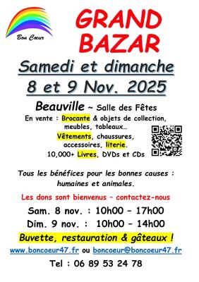 Salle plein avec brocante, vêtements, livres, jeux, linge, meubles.