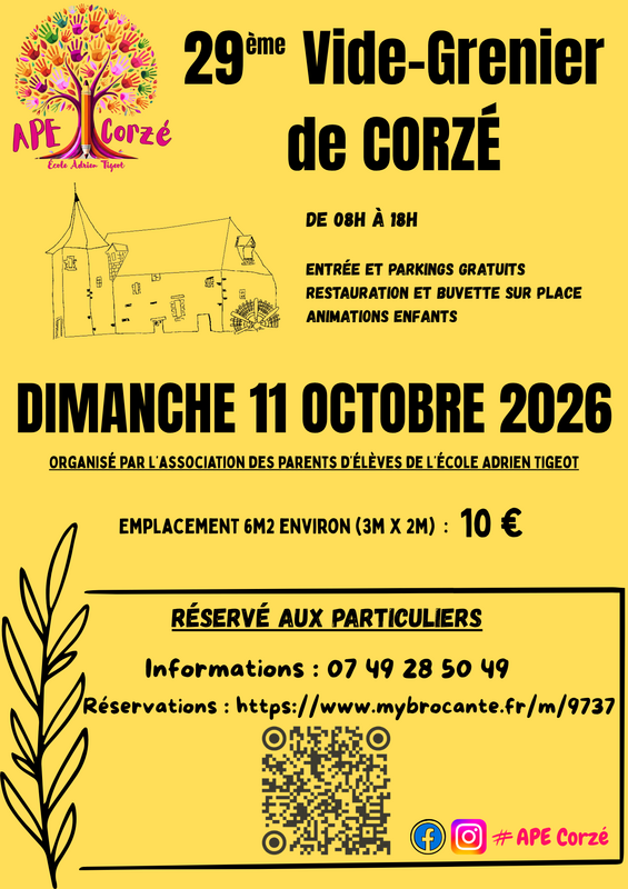 29ème vide-grenier de corzé organisé par l'association des parents d'élèves de l'école adrien tigeot, le dimanche 11 octobre 2026.