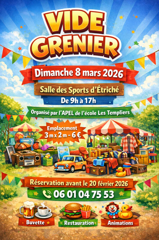 Venez participer au vide grenier le dimanche 8 mars 2026, attention inscrivez-vous vite. Les places sont limitées.