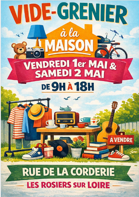 Nous organisons un vide-grenier à la maison aux rosiers-sur-loire, rue de la corderie : plusieurs amis, voisins réunis pour proposer une grande variété d’objets. Vous pourrez y découvrir du petit mobilier, divers outillages, des plantes, des contenants pour le jardin, des verres, des objets de décoration anciens ou plus récents, ainsi que des tableaux des 24 heures du mans. Livres, dvd, vêtements et bien d’autres curiosités seront également au rendez-vous.