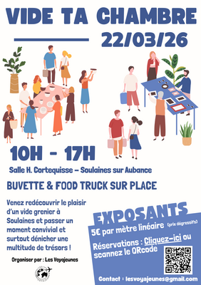 Le vide ta chambre est un événement convivial organisé par l’association de jeunes les voyajeunes. Sur le principe d’un vide-grenier, chacun peut venir vendre les objets dont il n’a plus besoin (vêtements, jeux, jouets, livres, décoration, petit matériel…). Une belle occasion de faire du tri, de donner une seconde vie aux objets et de passer un bon moment !
