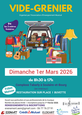 La 4ème édition du vide grenier organisé par l'association d'enseignement musical de soulaire et bourg (49) se déroulera le dimanche 1er mars 2026 de 8h30 à 17h.