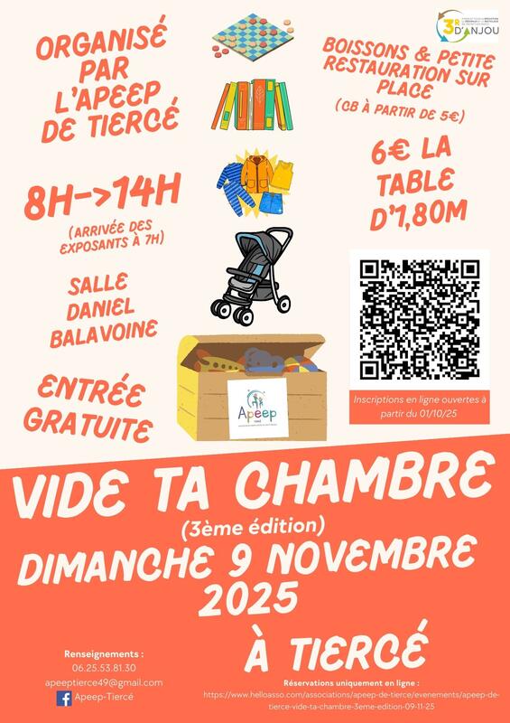 L'apeep de tiercé organise son troisième « vide ta chambre » le dimanche 9 novembre 2025, à la salle balavoine, à tiercé, de 8h à 14h.