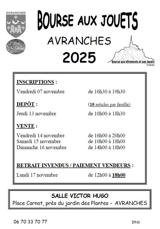 Bourse aux jouets : inscriptions des vendeurs vendredi 7 novembre de 16 h 30 à 19 h 30, tarif 2,50 € la feuille de dix articles. Dépôt des articles jeudi 13 novembre de 10 h à 18 h 30. Grande vente vendredi 14 novembre de 16 h à 20 h, samedi 15 novembre de 10 h à 18 h et dimanche 16 novembre de 14 h à 18 h. Paiement des articles et retraits des invendus lundi 17 novembre de 12 h à 18 h. Toutes ces opérations ont lieu salle victor hugo, place carnot à avranches.