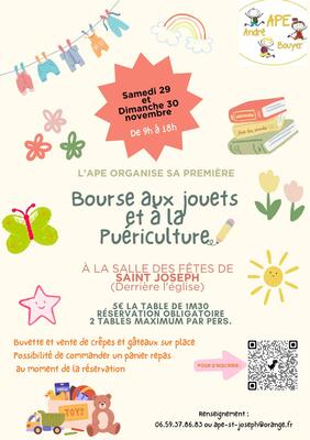 Nous organisons une bourse aux jouets et à la puériculture le 29 et 30 novembre 2025 ( complet le dimanche 30 novembre ) dans la salle des fêtes de saint joseph
