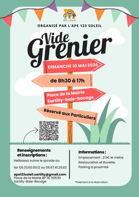 L'ape 123 soleil sartilly organise un vide grenier place de la mairie à sartilly ,venez nombreux exposer et chiner!Sur place buvette et restauration ,animation enfants .Ouvert à tous !Les fonds récoltés permettront de financer les projets scolaires des enfants des école publique .