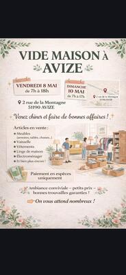 Petits meubles rustiques, chambre complète, 1 lit avec sommier, 1 armoire avec chevet, vaisselle, flûtes champagne, linge de maison, nappes, serviettes de table, bibelots, petit électroménager, vêtements hommes et femmes, lampes, fauteuils électriques, chaises, vases, cadres,