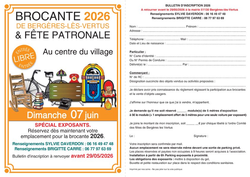 Brigitte reste à votre disposition pour toute autre information le dimanche 7 juin 2026, la brocante et la fête patronale seront au cœur de notre village pour le plaisir des grands et des petits.