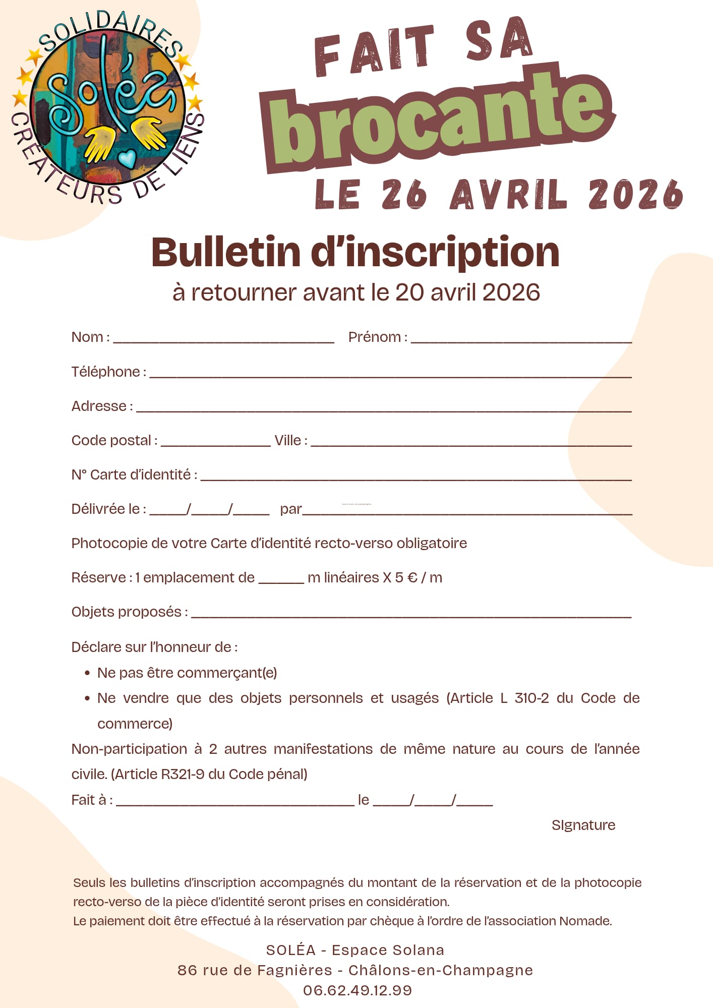 Lieu de fêtes et de rencontres, l'espace solana ouvre ses portes pour la première brocante de l'association soléa, créatrice de liens. Grand destockage, outillage et quincaillerie pour portails électriques, boîtes à outils, décos, vaisselle, vêtements...