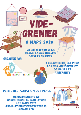 Notre association a organisé un vide-grenier afin de récolter des fonds. Les bénéfices obtenus permettront de financer différentes activités et projets au profit de nos actions associatives. Nous remercions chaleureusement toutes les personnes qui ont contribué à la réussite de cet événement.